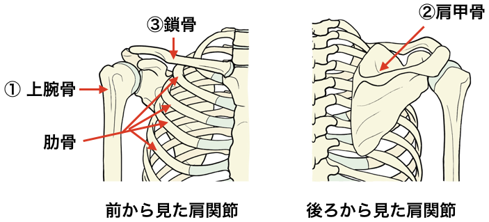 肩関節は① 腕の骨(上腕骨)、② 肩甲骨、③鎖骨からできています。肩関節に影響を及ぼす骨としては、肋骨なども関係してくると言われています。