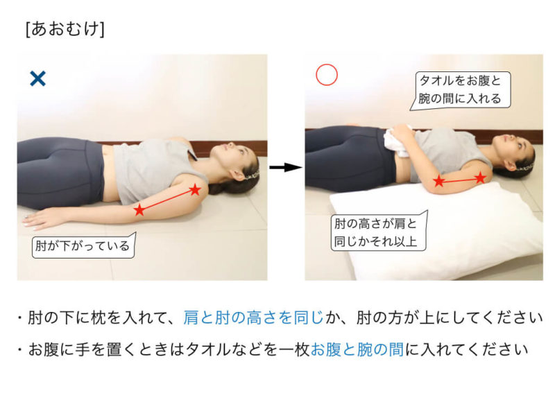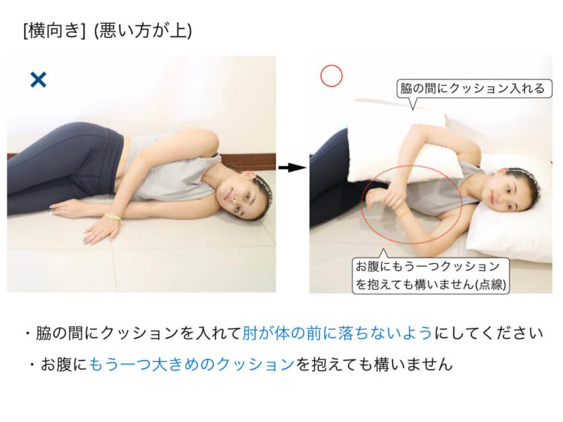 A、肩には痛みが出やすい腕の位置があります。クッションなどを肩の下に入れることリラックスして寝られるように工夫しましょう。具体的には図を参考にしてください。※ 炎症などが強い場合は枕を入れても痛みが続く場合があります。