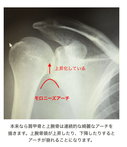 結論からいうと、上腕骨頭の上昇化で、腱板断裂の程度と挙上時にインピンジメントしやすいかどうかが推察できます。