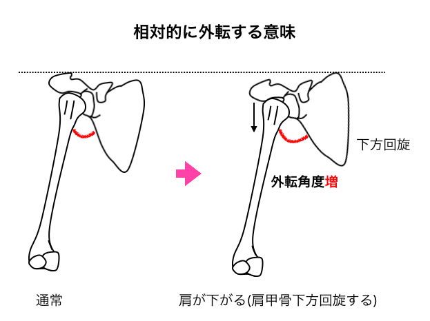 簡単です。肩甲が下方回旋しているかどうかをみるんです。下方回旋していると相対的に肩が外転位にあることを意味します。