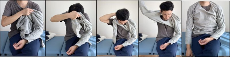 肩の痛みで最も困りやすいものの一つに『服の脱ぎ着ができない』があります。腱を痛めていようが、五十肩であろうが肩のどんな疾患でもこの問題は生じ、そして苦痛度が大きいです。服を着替えるときは、腕を通す際にどうしても腕を動かしてしまい痛みがでます。でも痛みなく実施するポイントがあります。それは・・・
