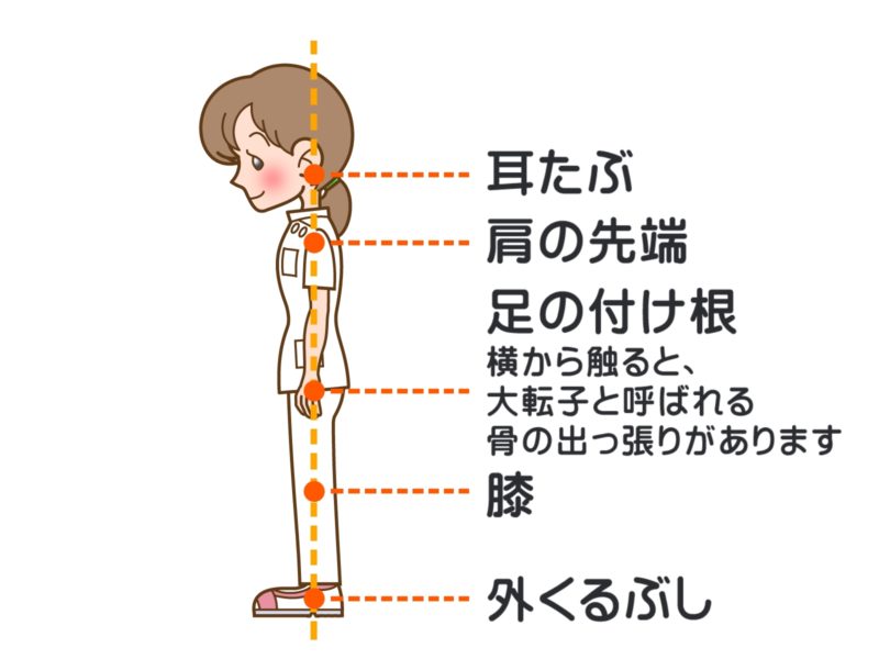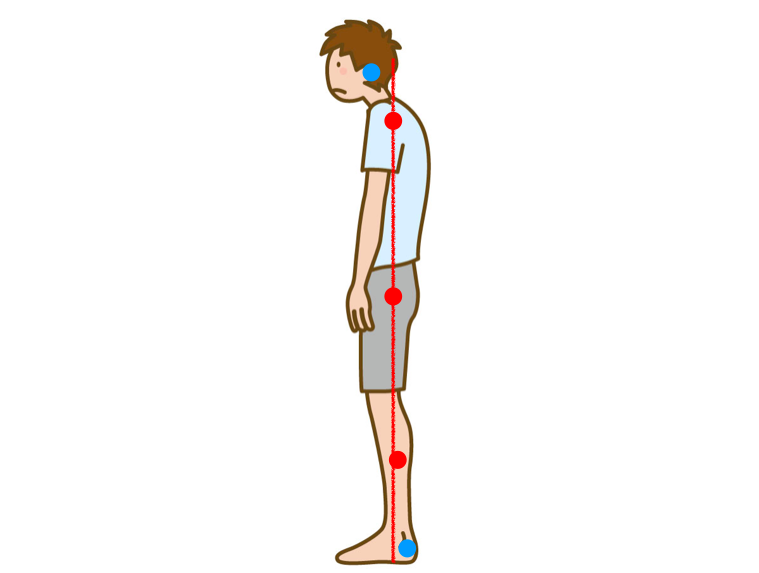 本日は肩こりを予防・改善する立ち姿勢について解説していきます。肩こりを予防するというふうに言いましたが、基本的に腰痛などどの症状でも良い立ち方というのは同じです。いい姿勢というのは肩こりや腰痛、首痛などあらゆる症状の予防になります。そのため、しっかりいい姿勢(正常)というのを覚えておく必要があります。いい姿勢とは図のように自然にたったときに「耳たぶ」「肩の先端」「足の付け根」「膝」「外くるぶし」が真っ直ぐに一直線になる姿勢です。この姿勢を取ることは、不必要に姿勢の筋力を使うことが予防することができ、肩こりや腰痛などの筋肉の痛みを予防することができます。