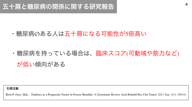 五十肩と糖尿病に関する研究報告です。糖尿病を持つ人は持たない人に比べて5倍五十肩になりやすく、また五十肩になった場合の臨床スコアが低いと報告されています。